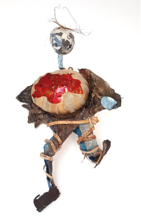 Au début, il y a un éventail de grand-mère, une boîte de conserve rouillée, une écorce venue du bout du monde et tant d’autres objets hétéroclites… Ils se rencontrent et s’apprivoisent mutuellement. Un peu d’argile, quelques morceaux de carton, quelques touches de peinture aident à créer une présence. Puis il s’agit patiemment d’enlever les parasites pour que le regard et la pensée puissent circuler, pour que le nouvel objet puisse rayonner.